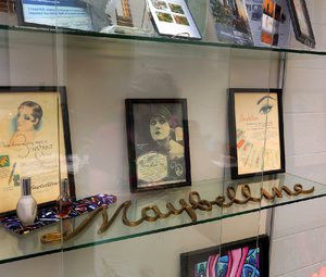 A drinking glass case outside Play a trick on'southward office displays an array of vintage items -- magazine ads (including one with actress Swanson), a brass Maybelline sign that earlier hung in the company's anteroom and some examples of early products.